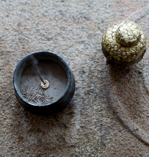 Wir sitzen auf Meditationskissen oder –bänkchen zur Wand hin ausgerichtet. Der Blick ist „passiv“, schräg vor uns auf dem Boden „abgelegt“. Um in die Selbstwahrnehmung zu kommen, konzentrieren wir uns zunächst auf das Kommen und Gehen des Atems. Die auftauchenden Gedanken, Gefühle, körperlichen Empfindungen nehmen wir wahr ohne sie zu bewerten oder ihnen zu folgen und lassen sie wieder ziehen.